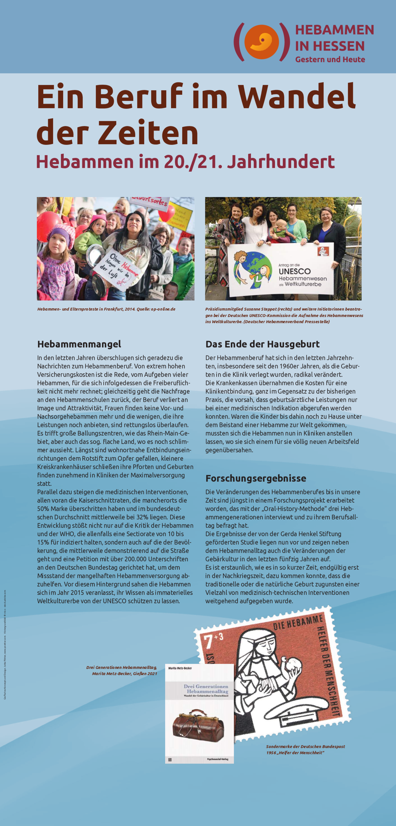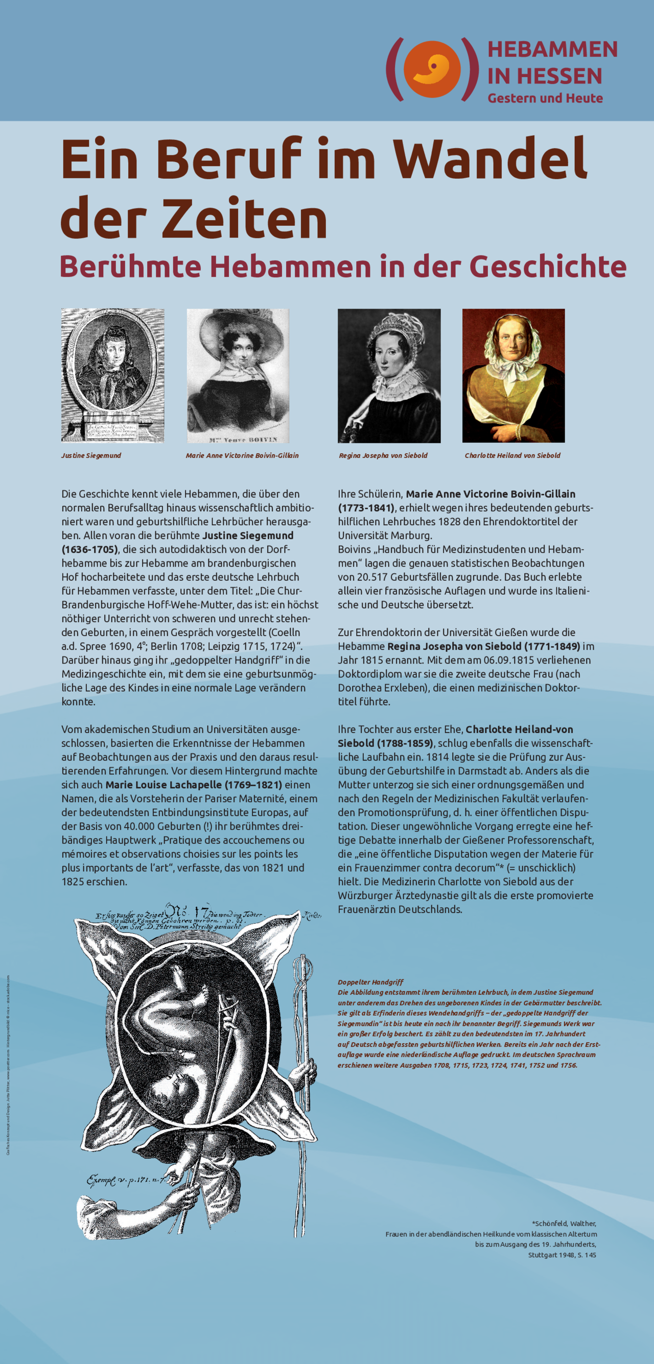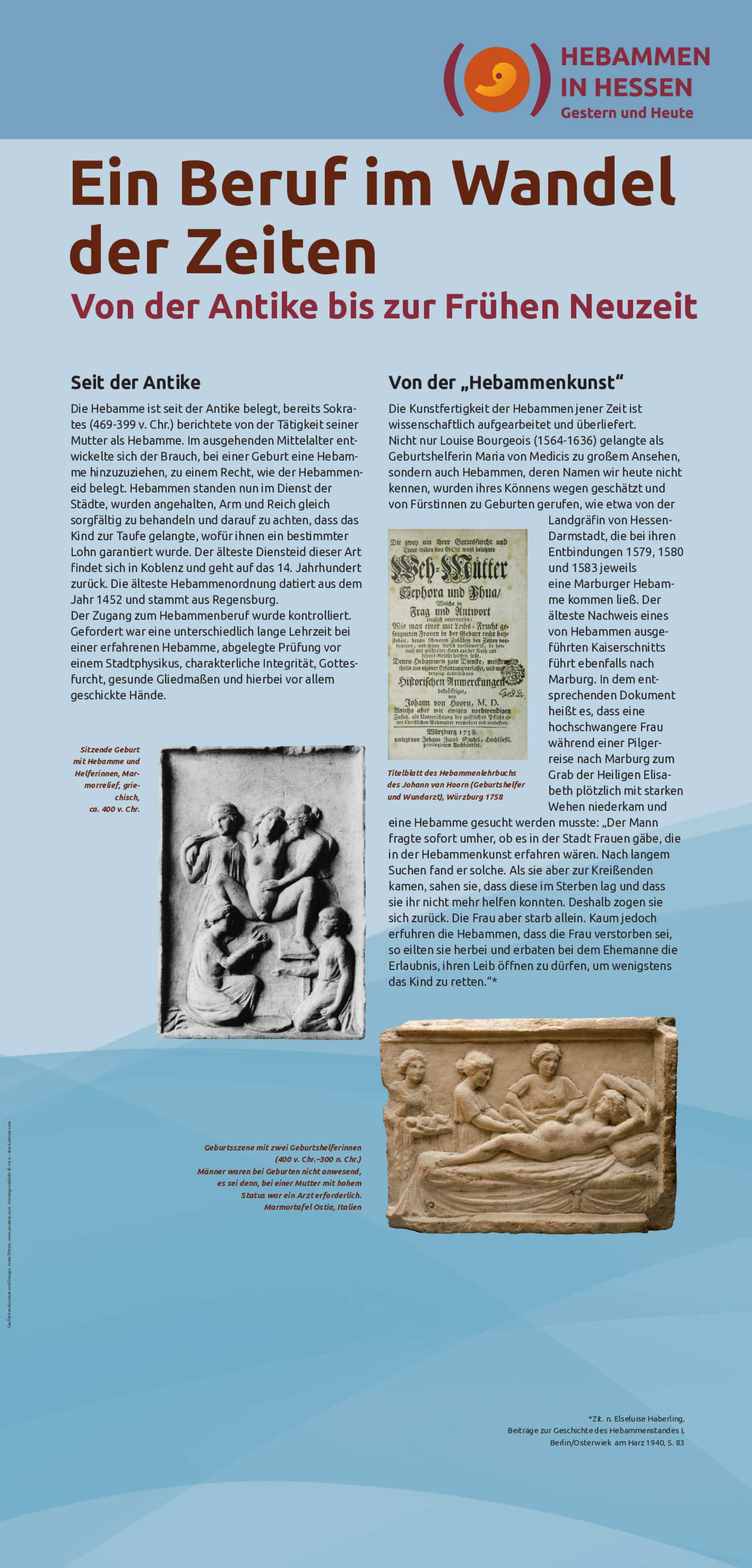 Die Ausstellung Hebammen in Hessen – Gestern und Heute möchte über die Geschichte eines der ältesten Berufe der Menschheit informieren, über die Entwicklung der Ausbildung im Laufe der Geschichte bis zum Studiengang heute, über Hebammen auf dem Land in Hessen, über ihre aktuelle berufliche Situation und über Möglichkeiten und Hilfsangebote für Hebammen und Schwangere/Wöchnerinnen.