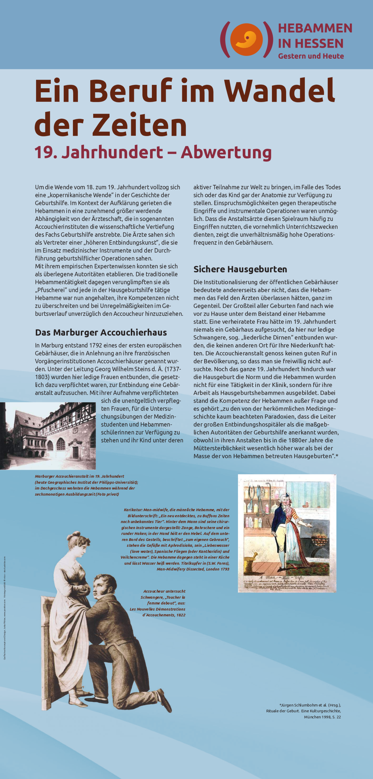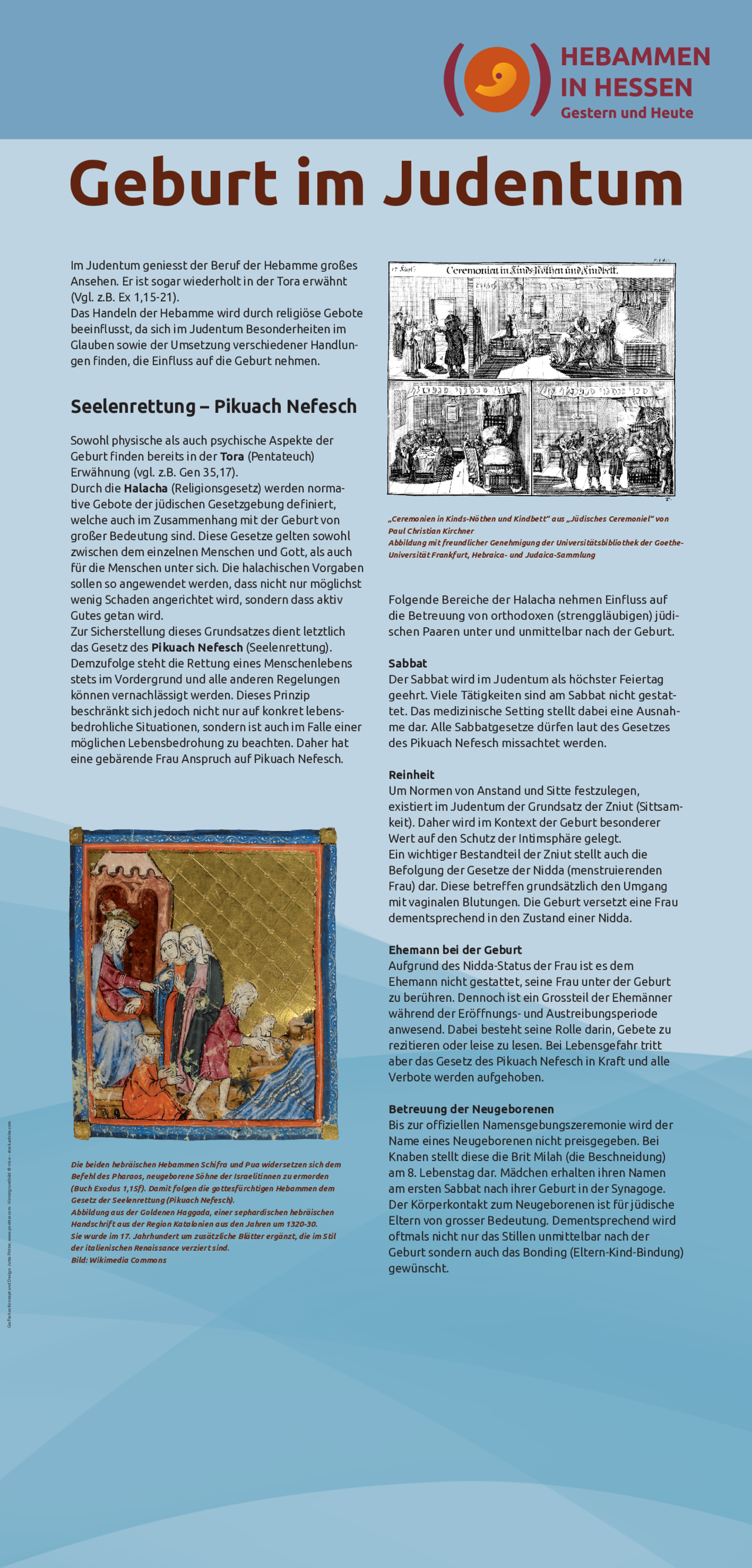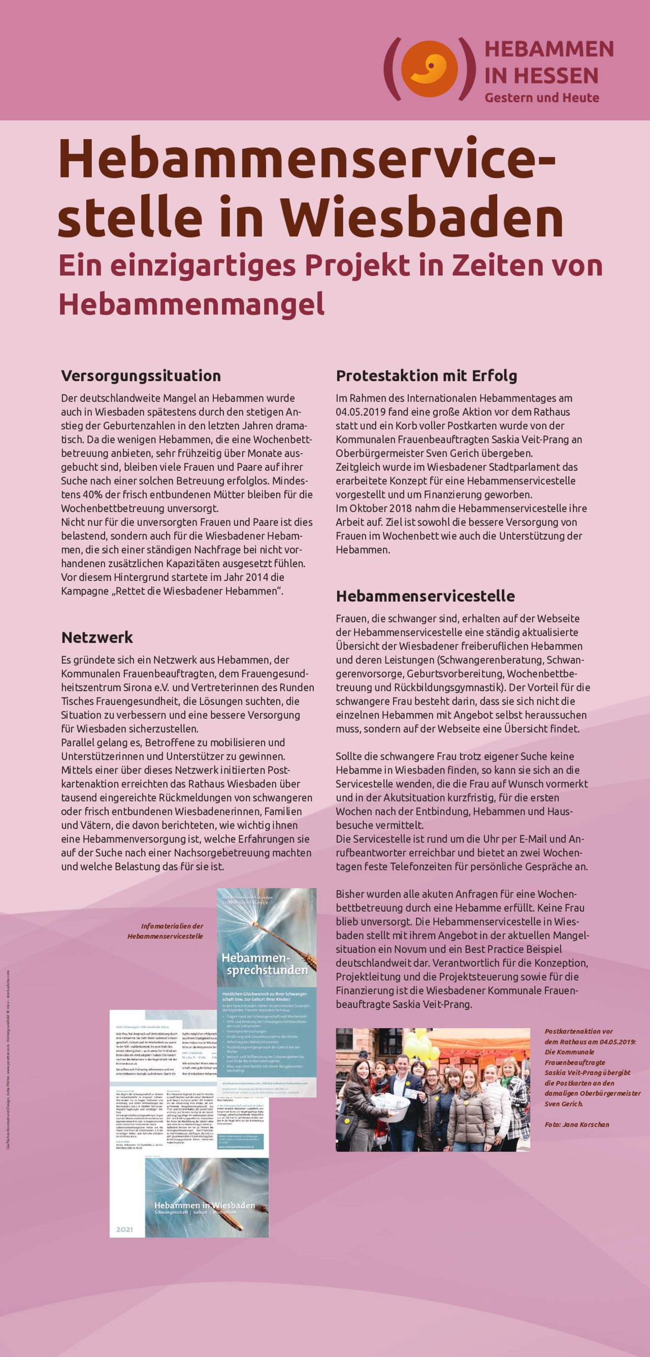 Die Ausstellung Hebammen in Hessen – Gestern und Heute möchte über die Geschichte eines der ältesten Berufe der Menschheit informieren, über die Entwicklung der Ausbildung im Laufe der Geschichte bis zum Studiengang heute, über Hebammen auf dem Land in Hessen, über ihre aktuelle berufliche Situation und über Möglichkeiten und Hilfsangebote für Hebammen und Schwangere/Wöchnerinnen.
