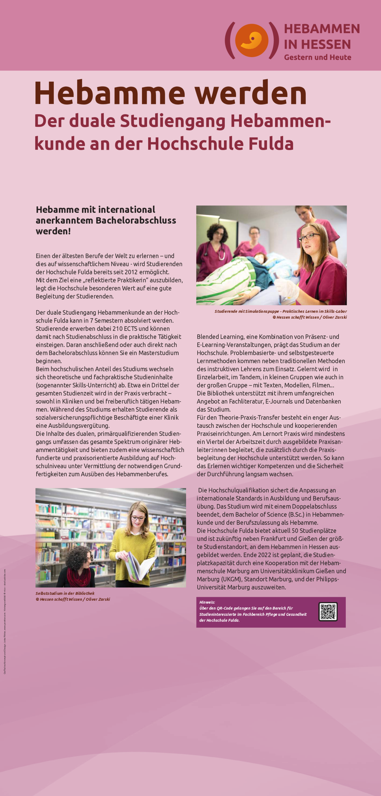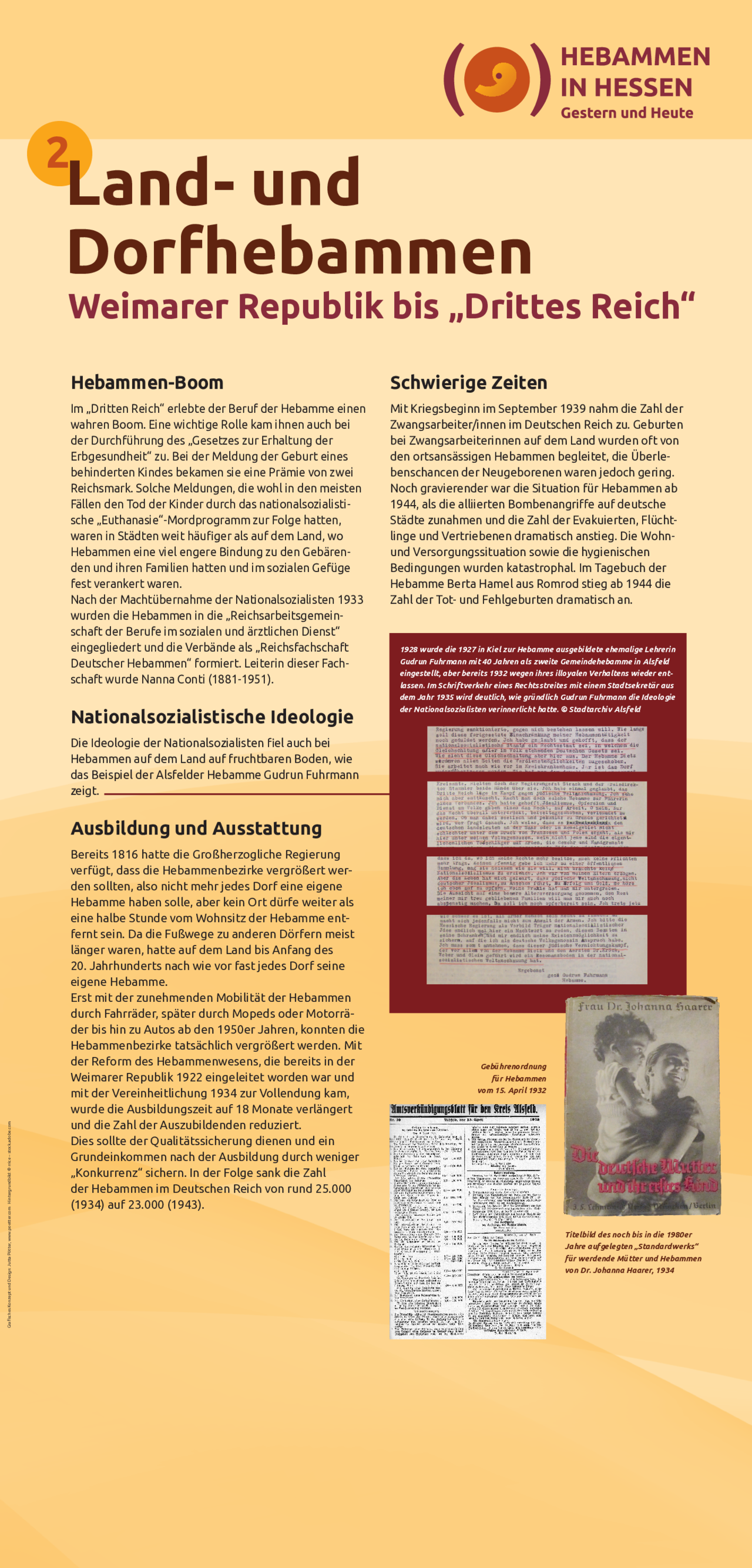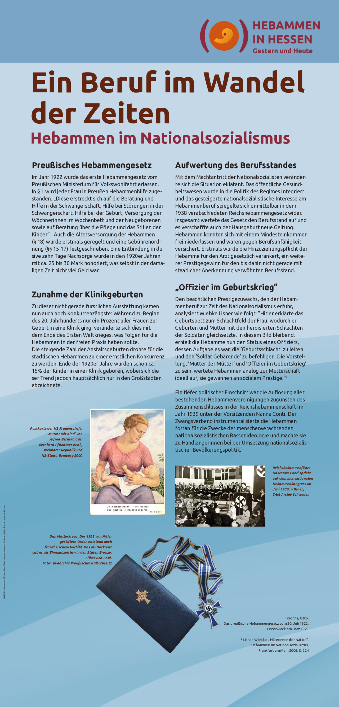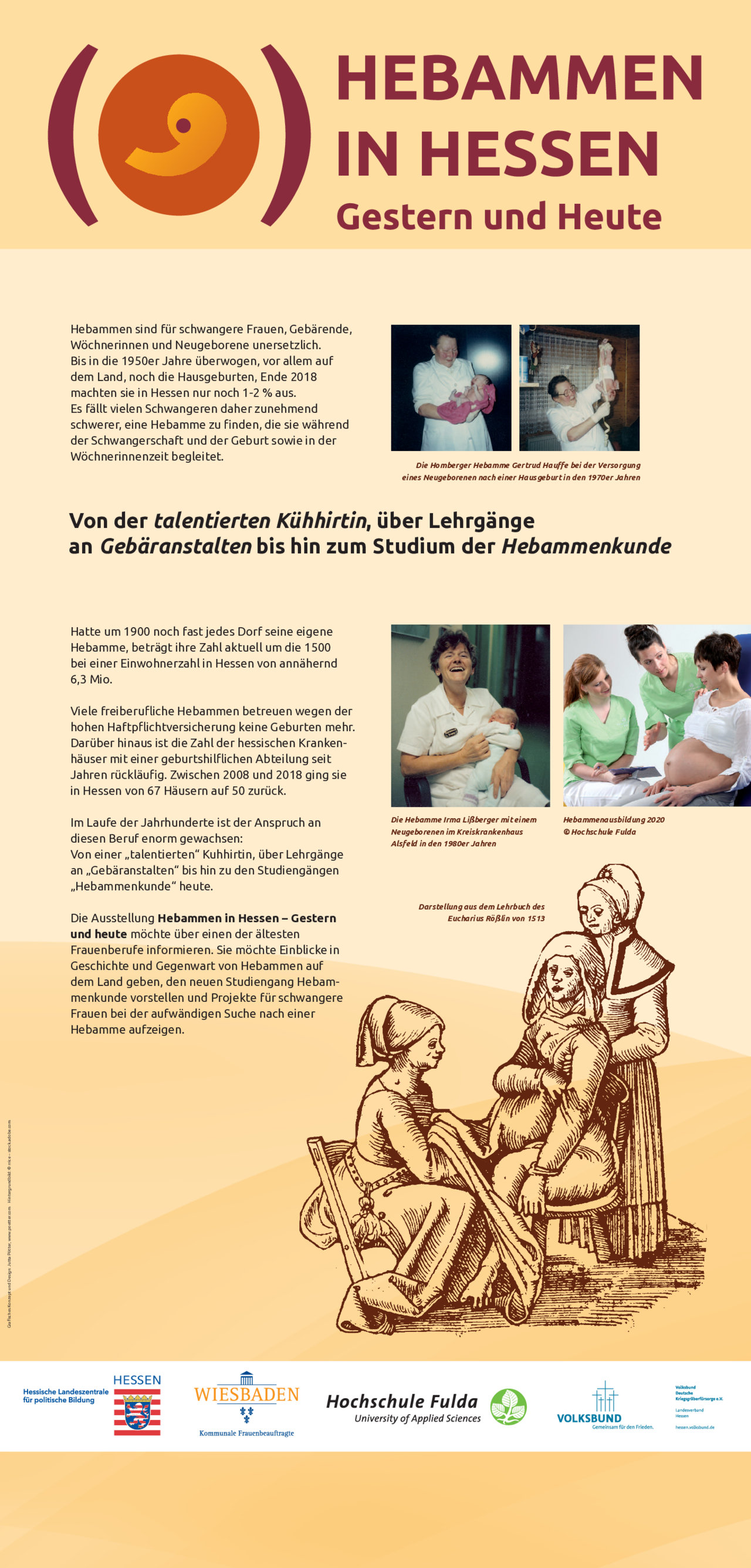 Die Hessische Landeszentrale für politische Bildung arbeitete in Zusammenarbeit mit der Hochschule Fulda, dem Volksbund Deutsche Kriegsgräberfürsorge e.V. LV Hessen und der Kommunalen Frauenbeauftragten der Landeshauptstadt Wiesbaden sowie Frau Prof. Dr. Marita Metz-Becker von der Philipps-Universität Marburg von 2020 - 2023 an der Ausstellung Hebammen in Hessen – Gestern und Heute, die sowohl digital zum Download als auch analog zur Ausleihe kostenlos zur Verfügung steht. Der Katalog zur Ausstellung kann hier bestellt werden.