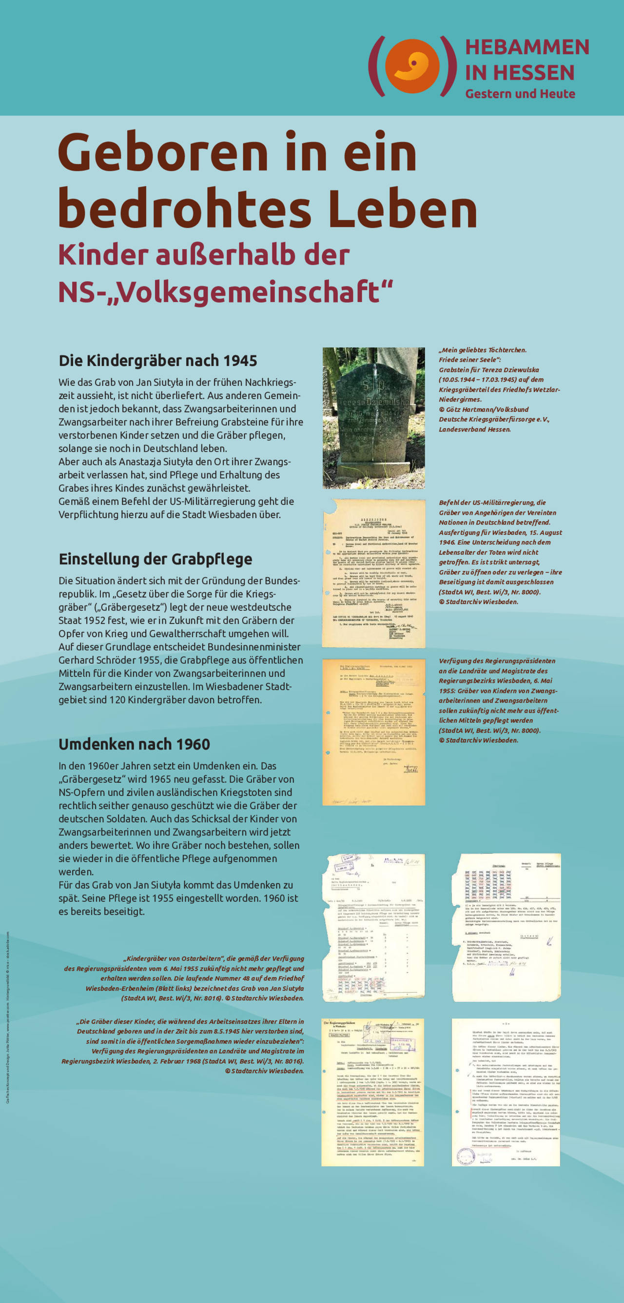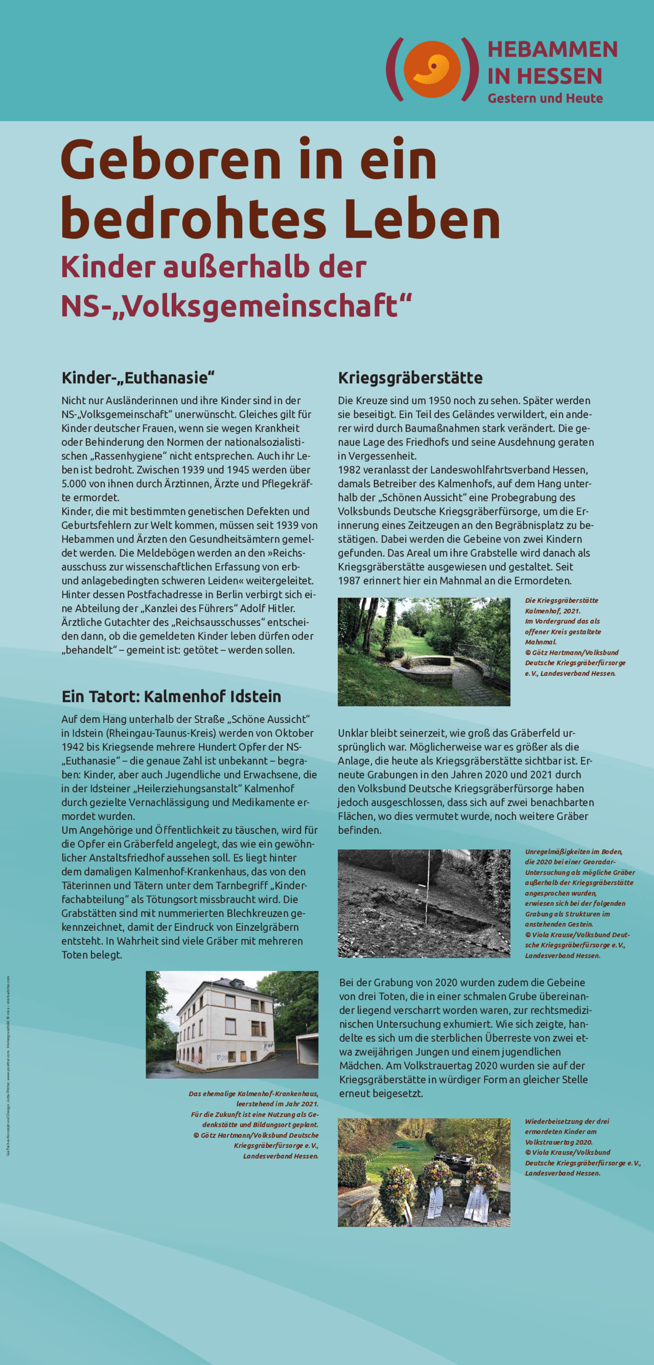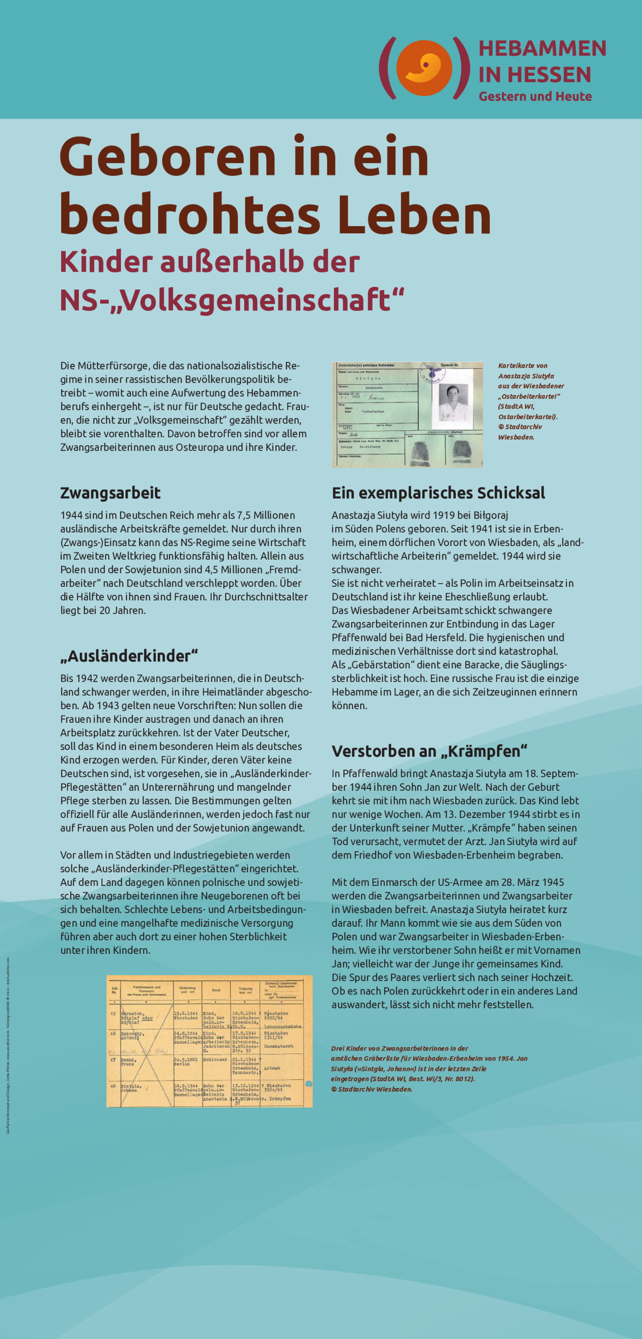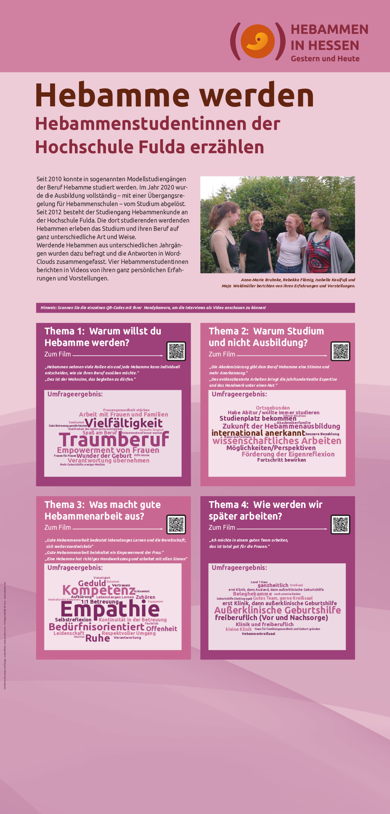 Die Hessische Landeszentrale für politische Bildung arbeitete in Zusammenarbeit mit der Hochschule Fulda, dem Volksbund Deutsche Kriegsgräberfürsorge e.V. LV Hessen und der Kommunalen Frauenbeauftragten der Landeshauptstadt Wiesbaden sowie Frau Prof. Dr. Marita Metz-Becker von der Philipps-Universität Marburg von 2020 - 2023 an der Ausstellung Hebammen in Hessen – Gestern und Heute, die sowohl digital zum Download als auch analog zur Ausleihe kostenlos zur Verfügung steht. Der Katalog zur Ausstellung kann hier bestellt werden.