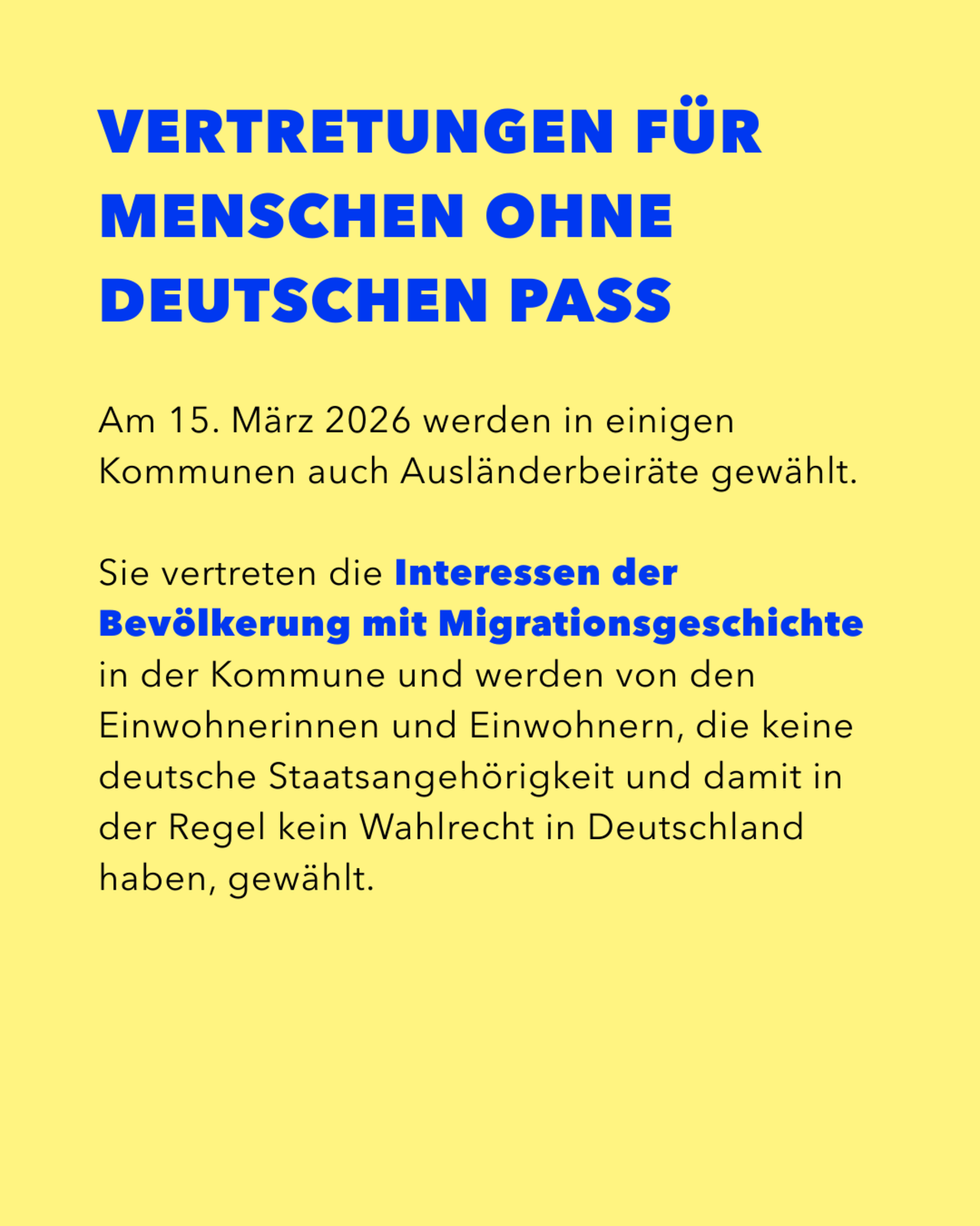 In einigen Kommunen und Landkreisen werden am 15. März auch Ausländerbeiräte gewählt. Diese vertreten die Interessen der Menschen, die keine deutsche Staatsangehörigkeit und damit in der Regel kein Wahlrecht in Deutschland haben. Ausländerbeiräte sorgen dafür, dass auch migrantische Anliegen gehört und Perspektiven eingebracht werden – für einen guten Lebensalltag für alle! Quelle: wahlen.hessen.de/sites/wahlen.hessen.de/files/2022-01/zeittafel.pdf