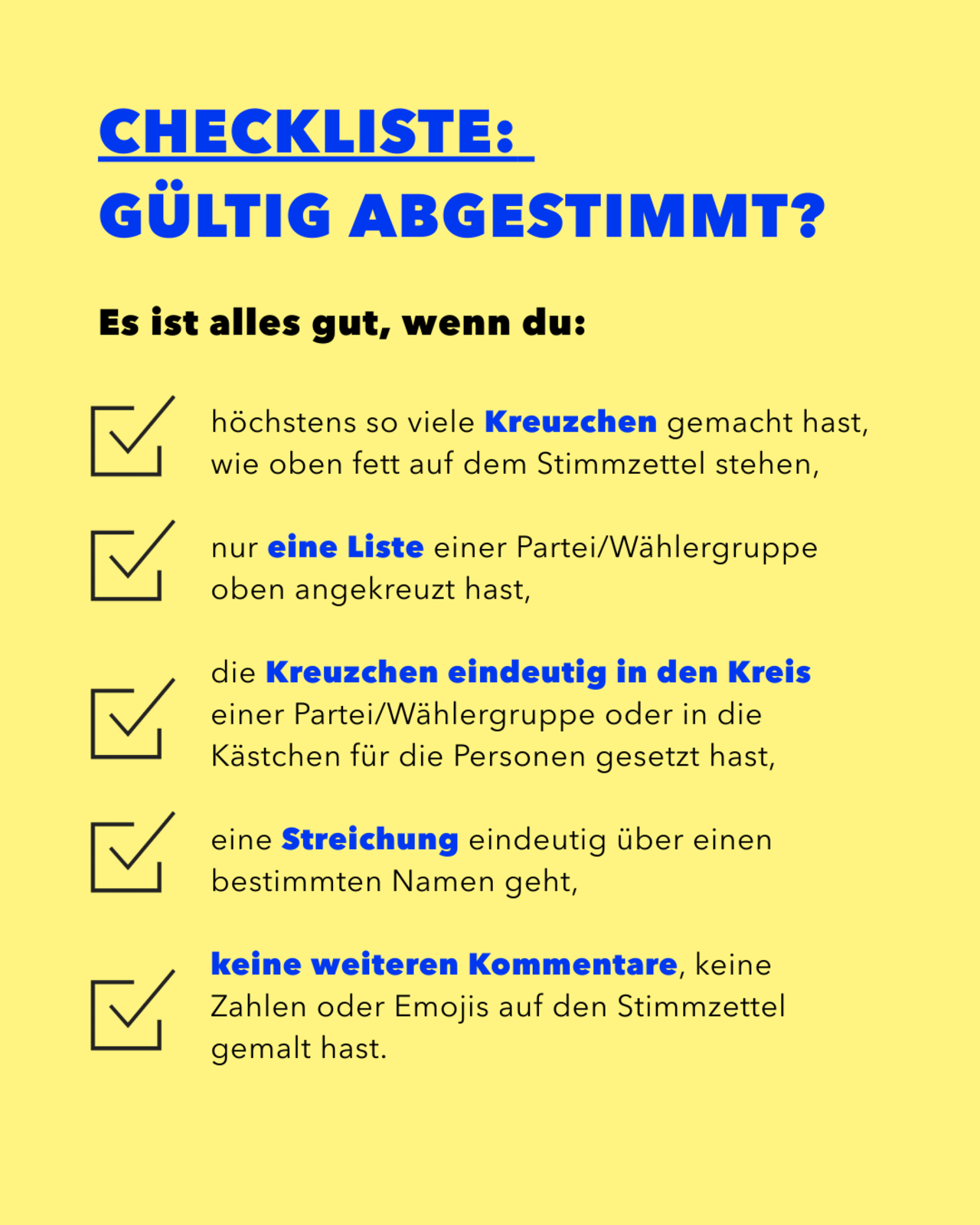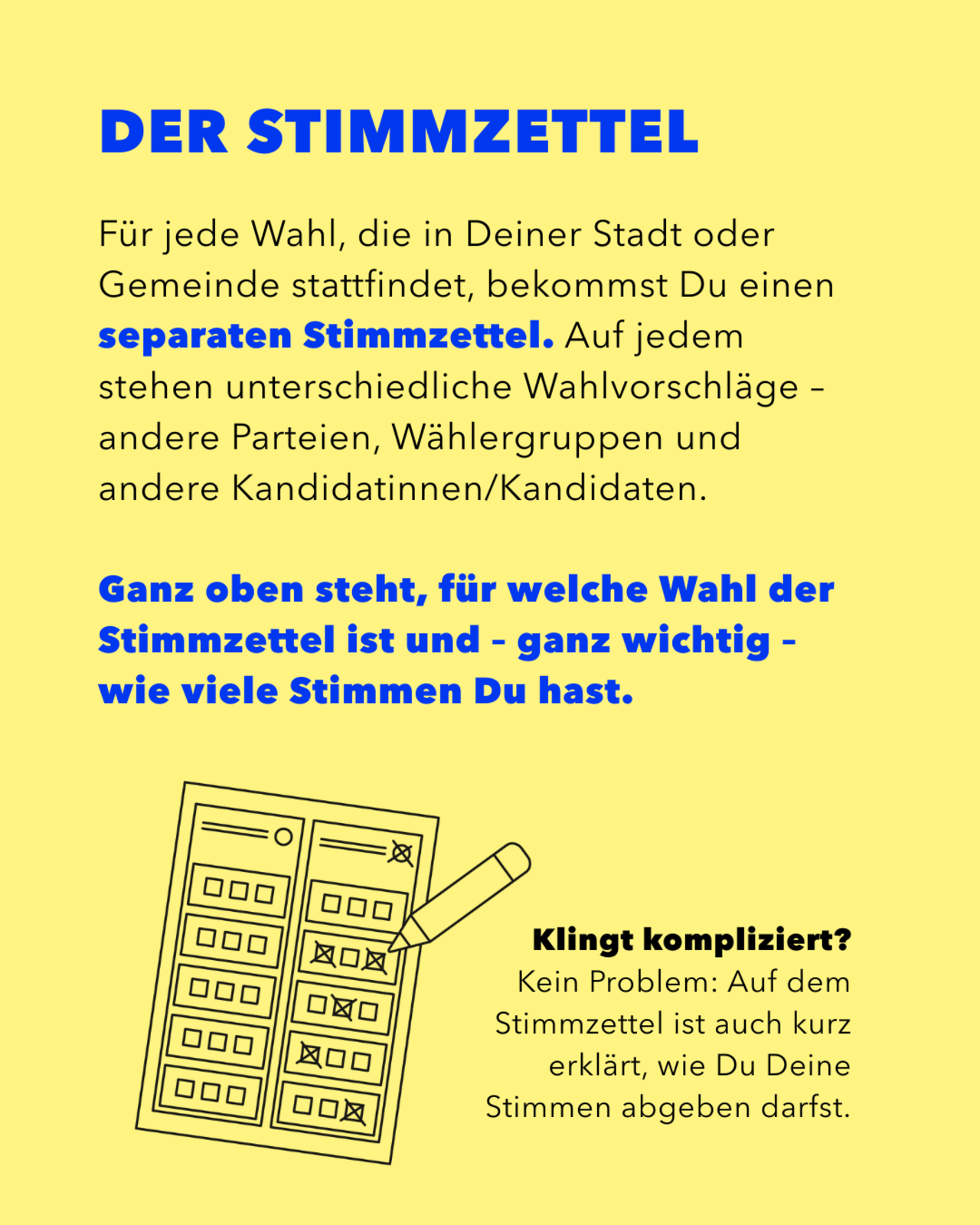 Klartext: Wie wird jetzt eigentlich gewählt? Der Wahlzettel mit allen Parteien, Wählergruppen und ihren Kandidierenden kann verwirrend sein. Wie viele Stimmen Du vergeben kannst, hängt von Deinem Wohnort ab.