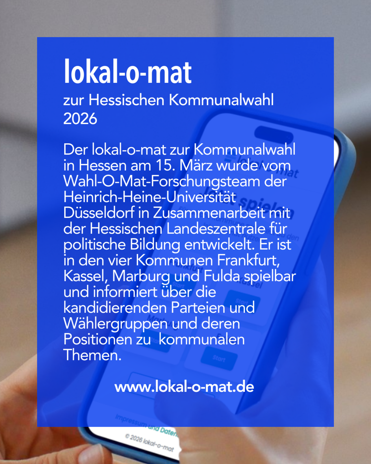 Deine Wahlhilfe für die Kommunalwahlen am 15. März: Wenn du in Frankfurt, Fulda, Marburg oder Kassel wählen darfst, kannst du ab jetzt mit dem lokal-o-mat inhaltlich eintauchen. Du kannst deine Position zu jeweils 30 Thesen mit denen der örtlichen Parteien und Wählergruppen vergleichen. Probier’s aus!