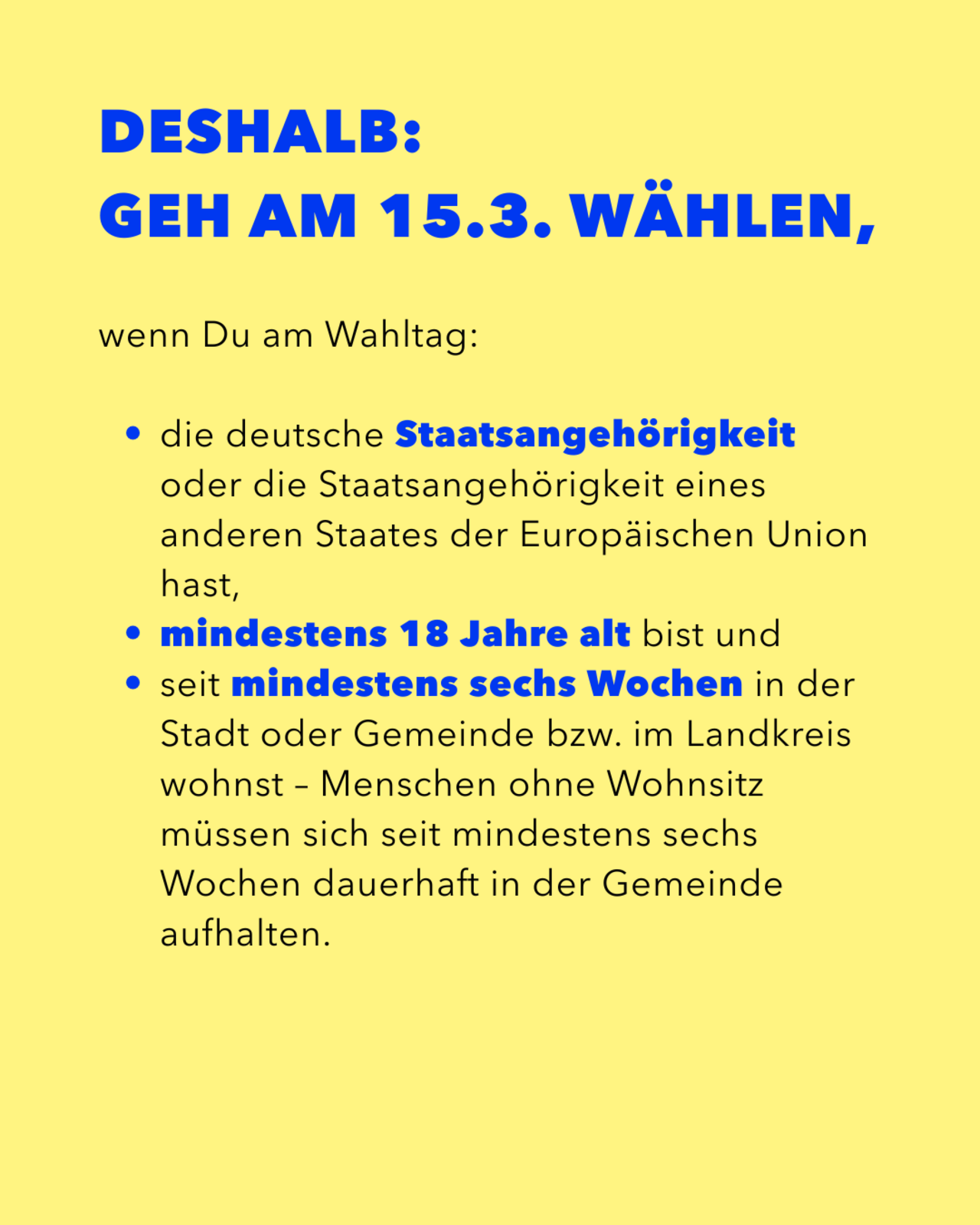 Du bist mindestens 18? Dann kannst Du am 15. März mitentscheiden, welche Politik in Deinem Wohnort gemacht werden soll und gleichzeitig etwas gegen die niedrige Wahlbeteiligung bei Kommunalwahlen tun.