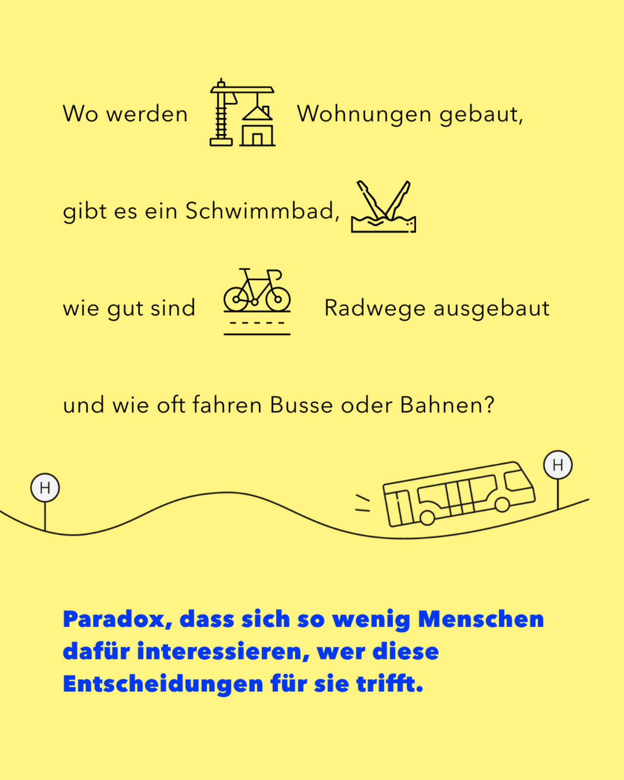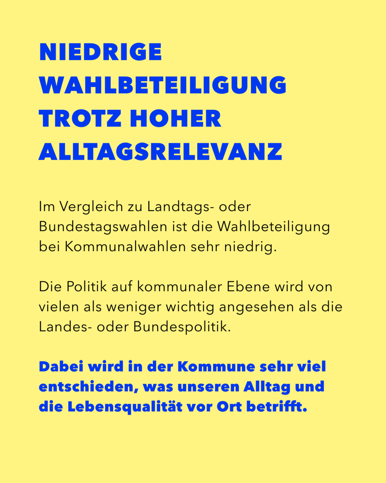 Denn: obwohl es näher gar nicht geht, werden Kommunalwahlen oft als weniger wichtig erachtet als beispielsweise die Bundestagswahl. Das müssen wir ändern!