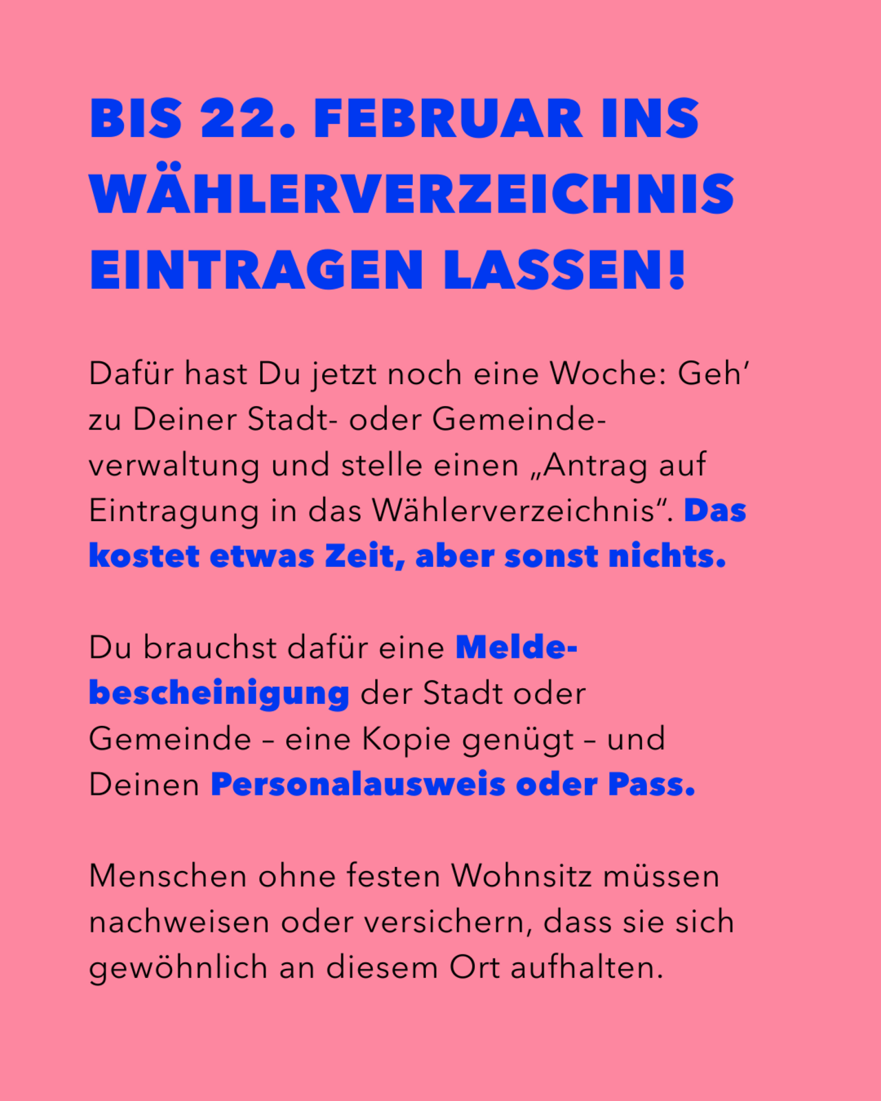 Damit Du am 15. März Deine Stimme abgeben kannst, musst Du im Wählerverzeichnis eingetragen sein. Wenn Du unsicher bist, kannst Du das bei deiner Stadt- oder Gemeindeverwaltung überprüfen.