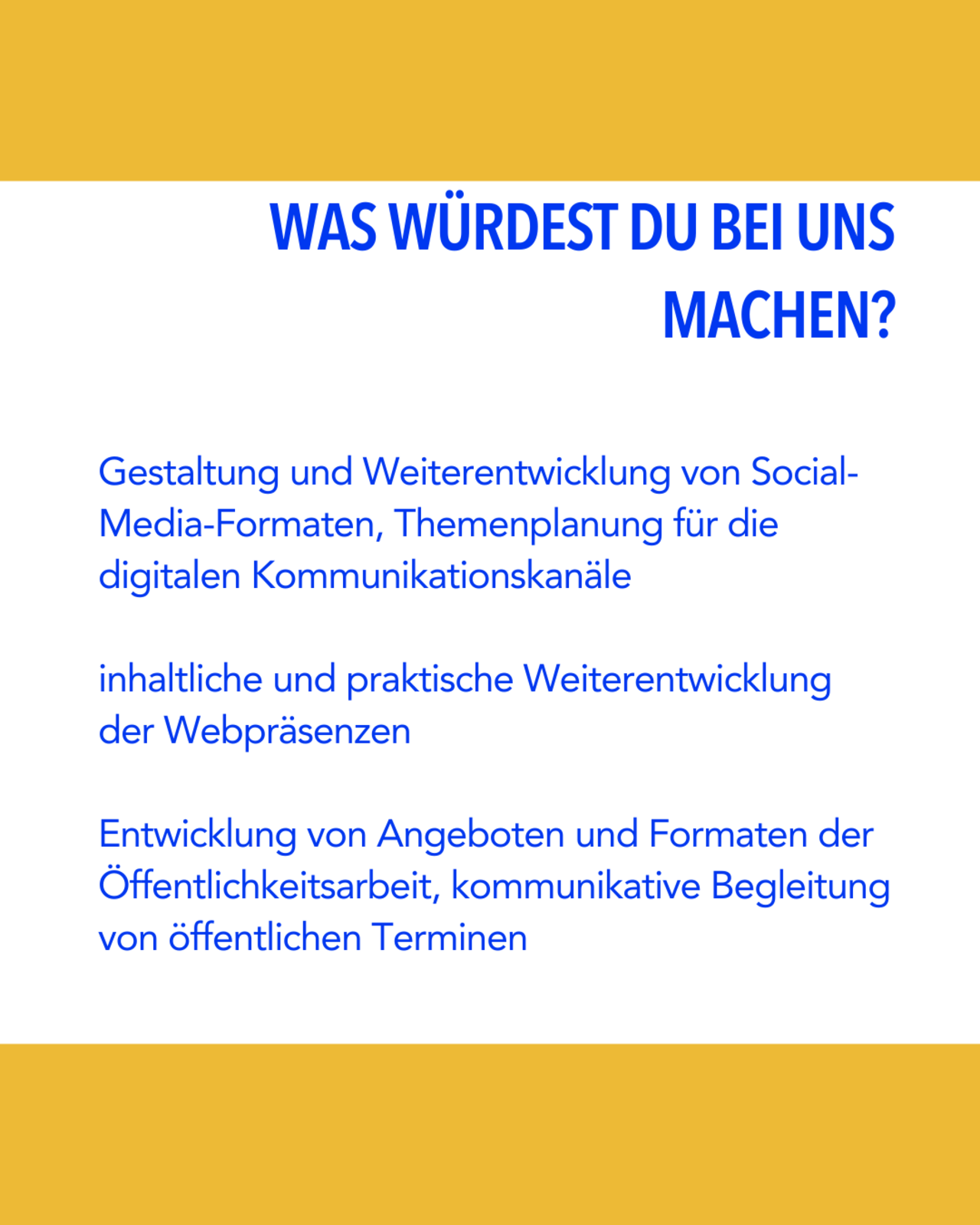 Du folgst unserer Arbeit hier auf Social Media, hast aber eigentlich 100 Ideen, wie der Auftritt noch besser werden könnte? Gute Nachrichten: Setze die Ideen um - wir stellen ein