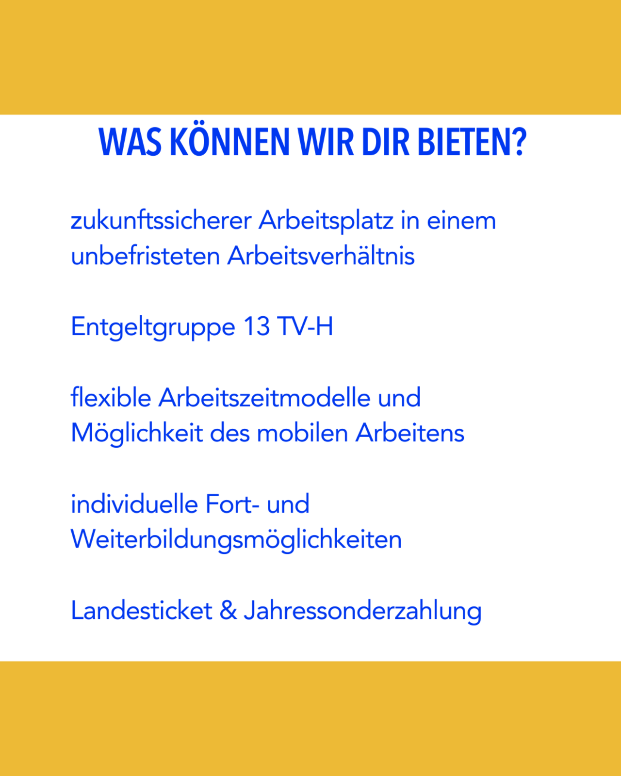 Wir bieten dir ein unbefristetes Beschäftigungsverhältnis, flexible Arbeitszeiten, ein LandesTicket Hessen und vieles mehr. Das klingt interessant? Dann findest du hier mehr Informationen: https://hlz.hessen.de/hlz/stellenausschreibungen
