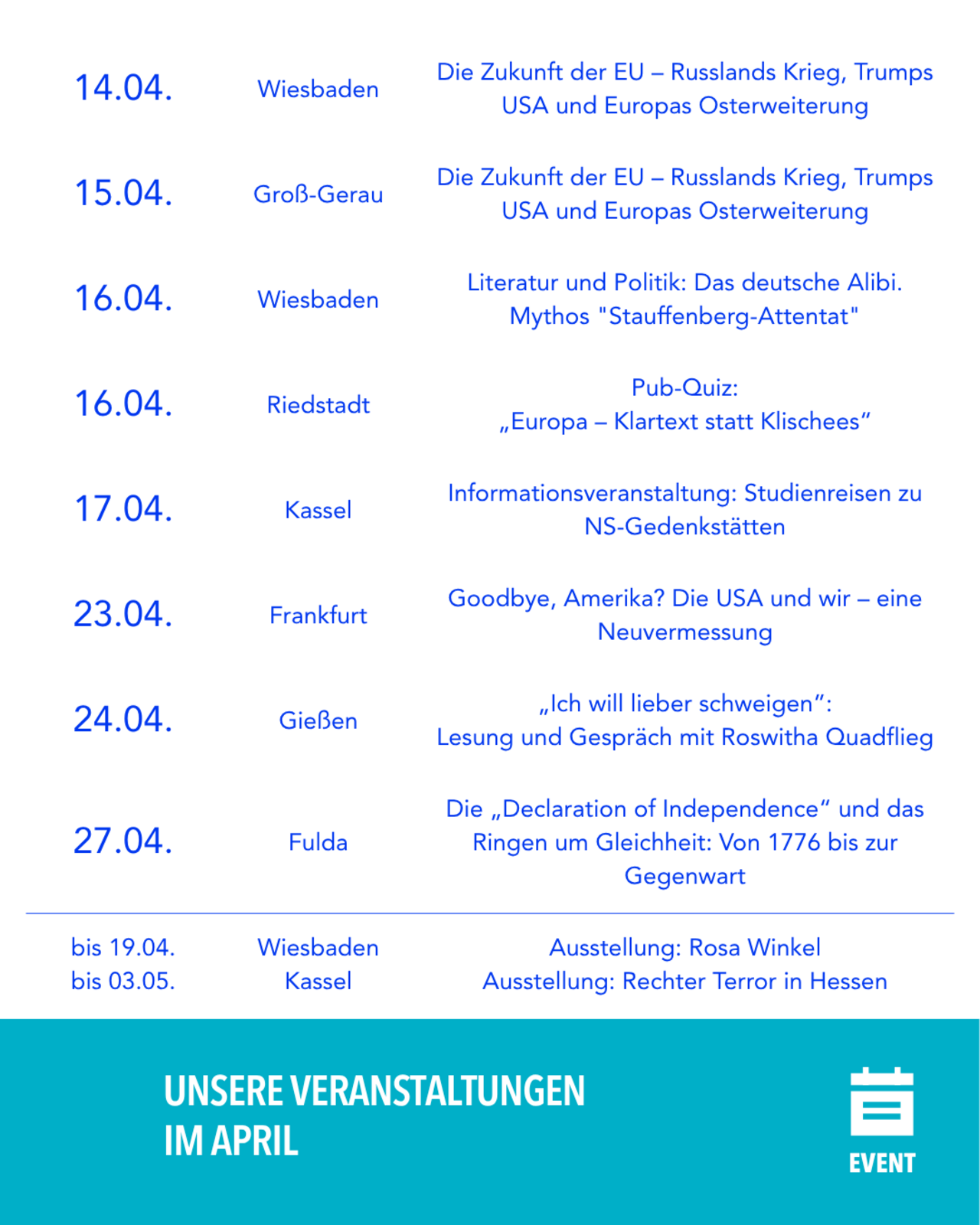 Ein neuer Monat - viele neue Veranstaltungen. Von Kassel bis Groß-Gerau, vom Pub-Quiz über Europa-Klischees bis zu Lesungen über die NS-Zeit. Wir freuen uns auf dich und deine Beiträge!