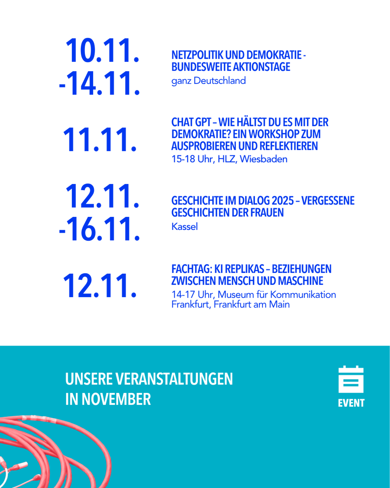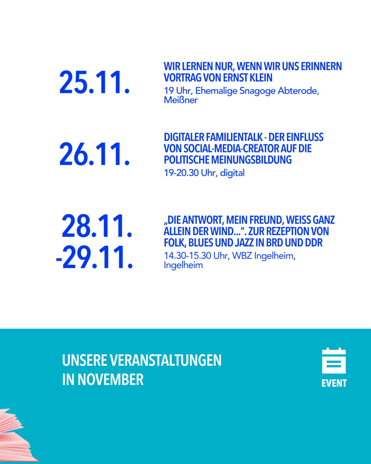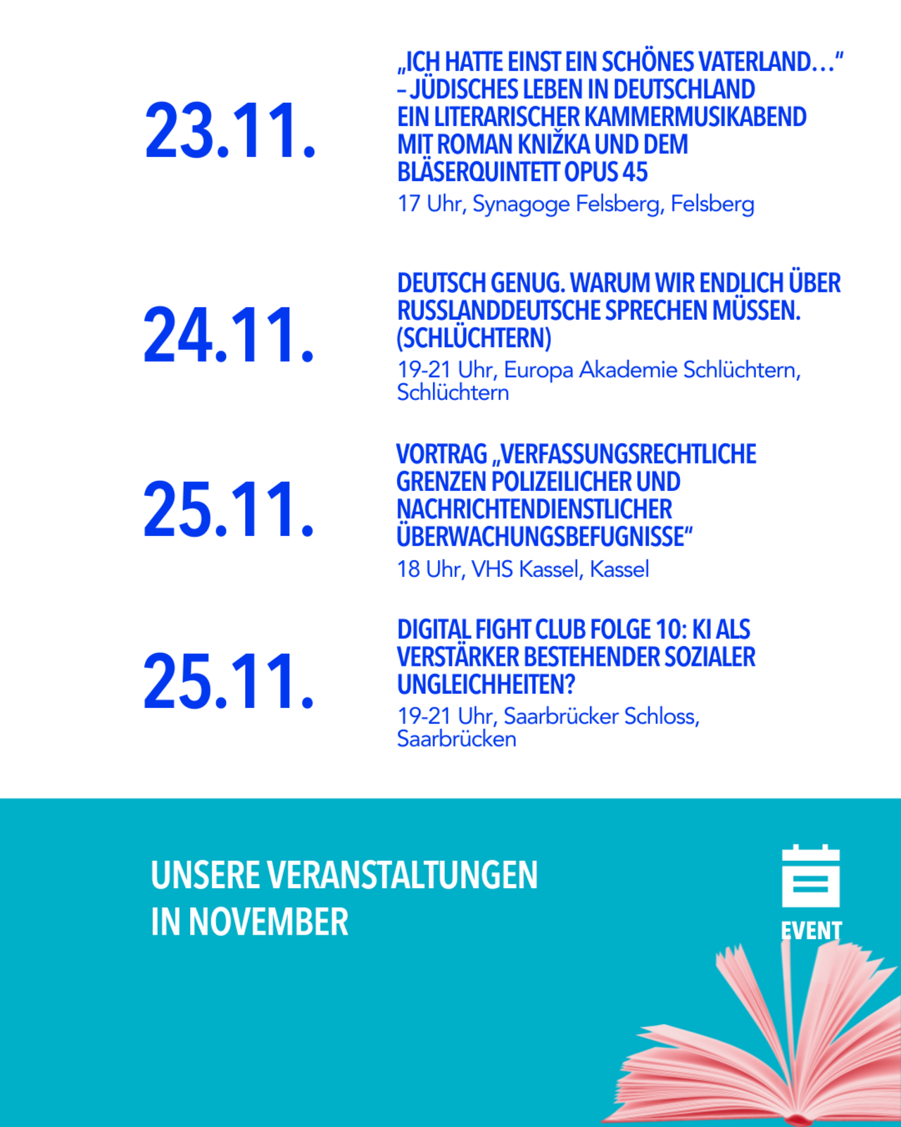 Unser November ist vollgepackt mit Lesungen, Vorträgen, Gesprächsrunden und vielem mehr. Wir freuen uns, wenn ihr vorbeischaut!