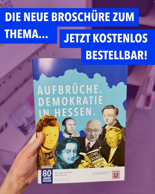Anlässlich des 80. Gründungsjubiläums des Bundeslandes Hessen erzählen wir in der Broschüre "Aufbrüche. Demokratie in Hessen" und auf unserer Webseite viele spannende Fakten, Geschichten und Anekdoten. Die Inhalte starten schon lange vor dem Gründungsjahr mit den ersten Anfängen demokratischer Gedanken in Hessen und begleiten die Vorgeschichte Hessens über den Anfang des 20. Jahrhunderts, die Zeit nach dem zweiten Weltkrieg bis hin zur tatsächlichen Gründung im Jahr 1946. Danach geht es weiter mit dem Wirtschaftswunder, der besonderen Beziehung zwischen Thüringen und Hessen und vielem mehr. Die Broschüre ist kostenfrei bestellbar. Viel Spaß beim Entdecken!