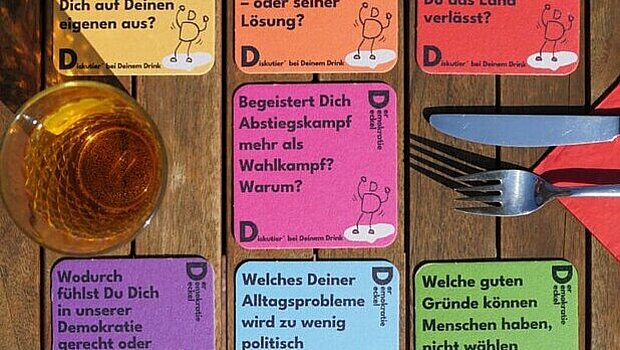 Auch der Demokratiedeckel wurde bei der Jungen Akademie Frankfurt konzipiert. Auf zunächst sieben farbenfrohen Pappuntersetzern sind Fragen rund um das eigene Demokratieverständnis aufgedruckt. Sie sollen zum Nachdenken und zum Austausch in entspannter Atmosphäre anregen. Im Rhein-Main-Gebiet liegen sie als politischer Snack zum Getränk in einigen Gasthäusern auf den Tischen. Nach und nach gibt es von dem mittlerweile gegründeten Verein neue Deckel mit neuen Fragen zur „Stimmungslage“ in Deutschland.