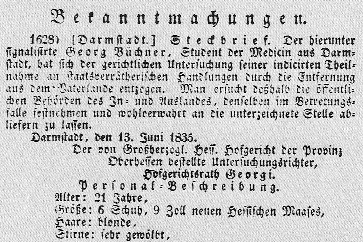 dem Butzbacher Pfarrer Friedrich Ludwig Weidig schreibt er 1834 anonym den nur wenige Seiten starken Hessischen Landboten, der mit dem Ausruf „Friede den Hütten! Krieg den Palästen!“ beginnt. Büchner und Weidig prangern darin die unhaltbaren politischen und sozialen Zustände in dem damaligen Großherzogtum an. Die konspirativ verteilte Schrift löst eine intensive und blutige Untersuchung durch Polizei und Justiz aus. Zahlreiche Mitverschwörer werden verhaftet. Weidig stirbt im Gefängnis. Georg Büchner, unterdessen steckbrieflich gesucht, kann zunächst nach Straßburg und dann nach Zürich fliehen. Noch in Darmstadt hat er sein Revolutionsdrama Dantons Tod beendet, das wegen der Zensur 1835 nur in einer bearbeiteten Fassung erscheinen kann. In Straßburg und Zürich arbeitet Büchner an dem Lustspiel Leonce und Lena, an dem Novellenfragment Lenz und an der Tragödie Woyzeck, die unvollendet bleibt. Im Sommer 1836 reicht er in Zürich seine Dissertation über das Nervensystem der Flussbarbe ein. Im Oktober übersiedelt er als politischer Flüchtling der „Sonder-Klasse“ nach Zürich, wo er am 19. Februar 1837 an Typhus stírbt.